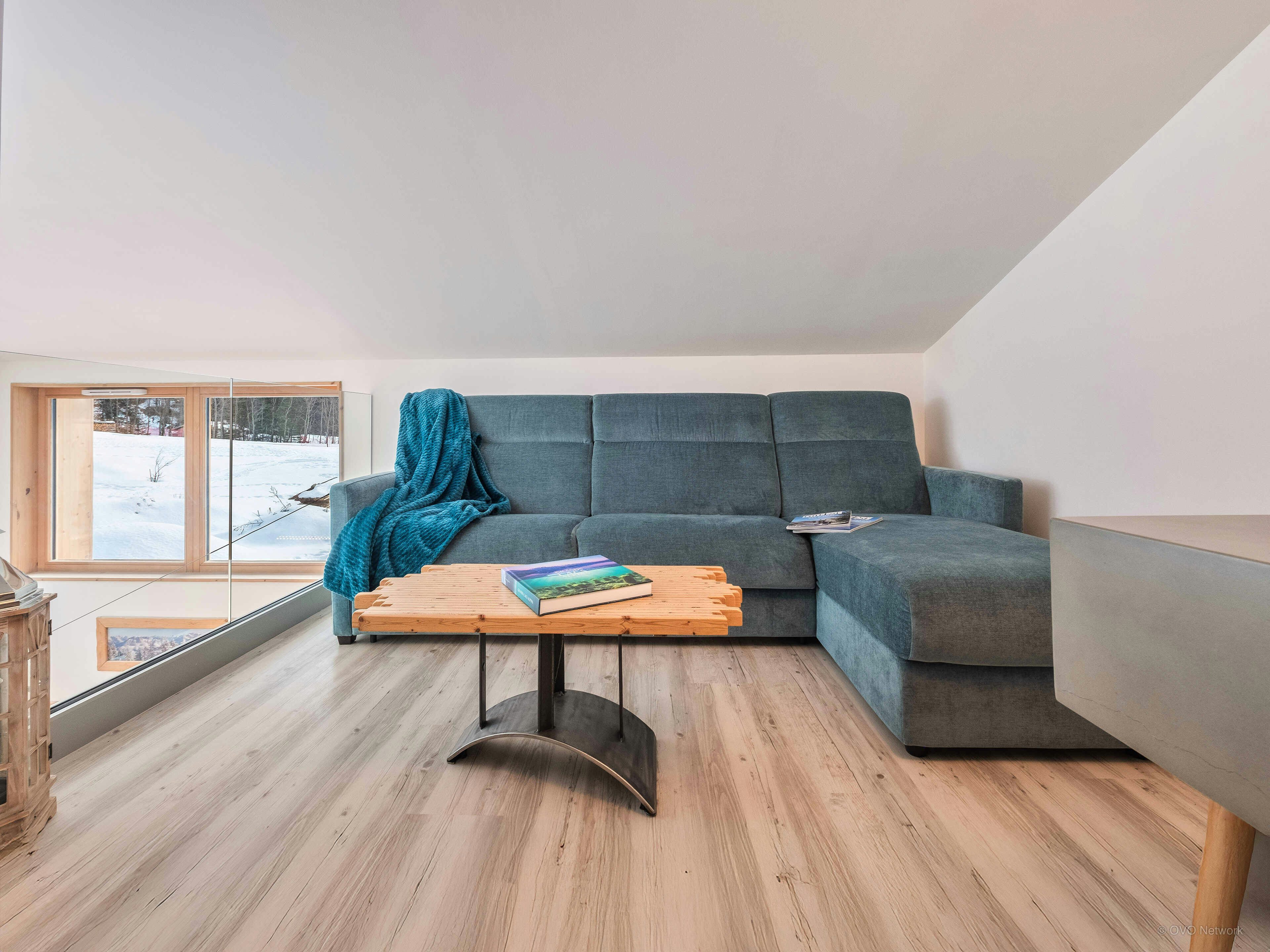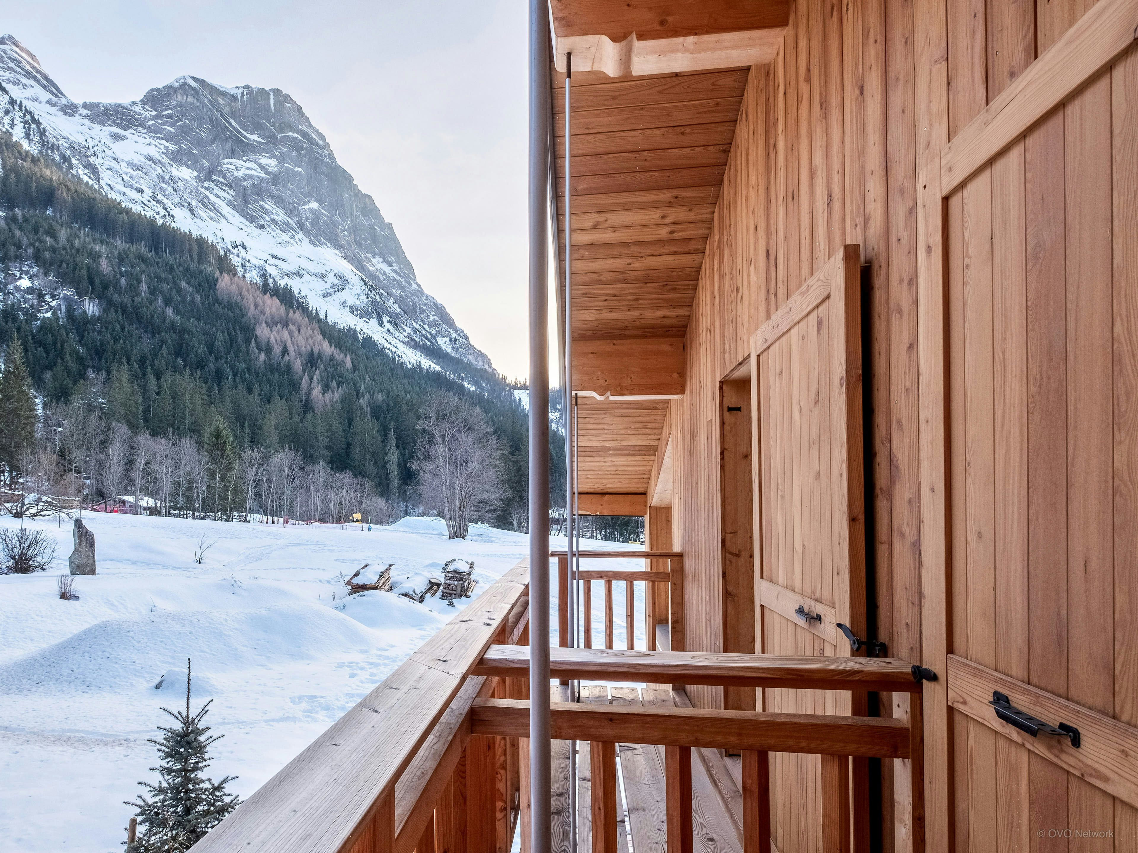 In the main living area, the wood-burning stove adds to the cosy atmosphere for sharing time together. Large picture windows flood the space with natural light and invite guests to step out onto the terrace, which wraps around two sides of the chalet.